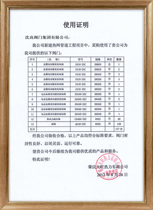 肇慶大旺熱力使用證明