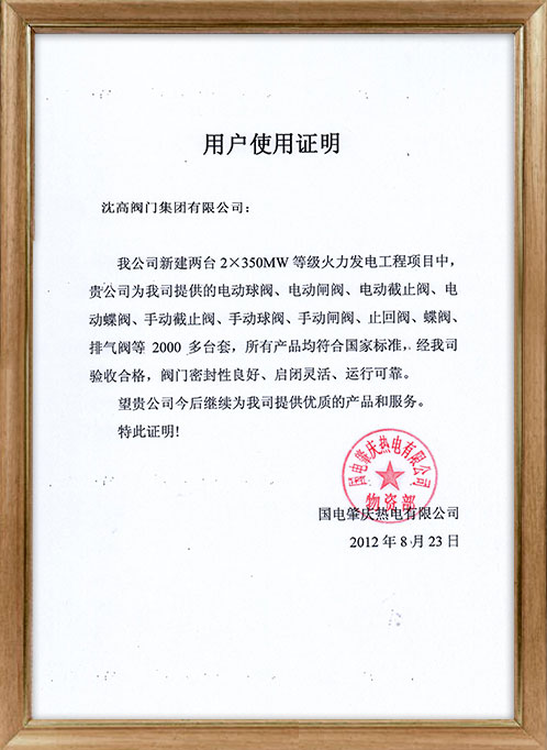 國電肇慶熱電使用證明