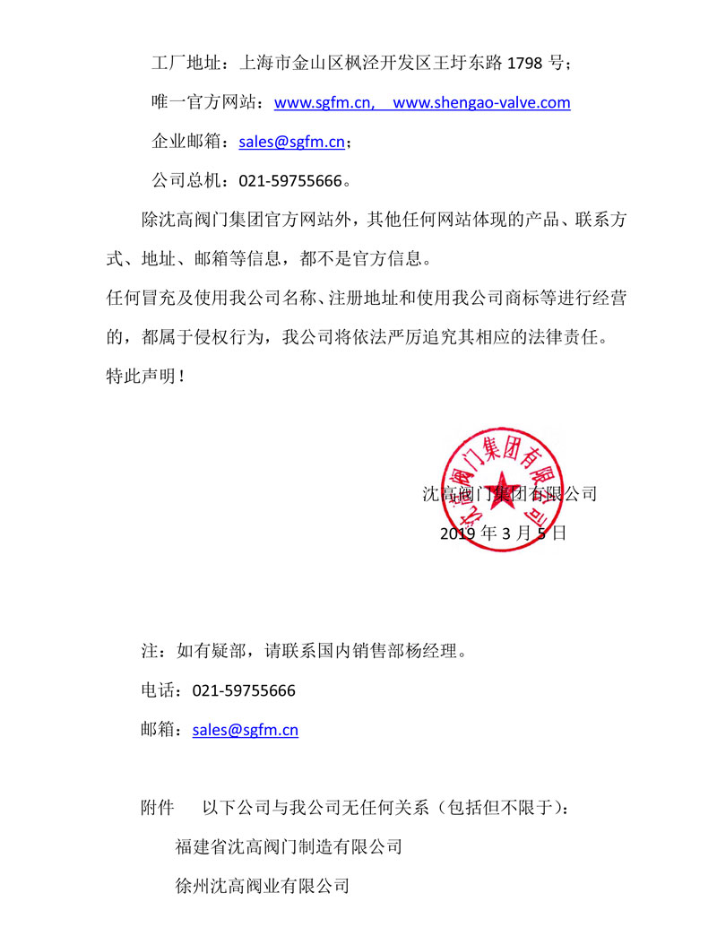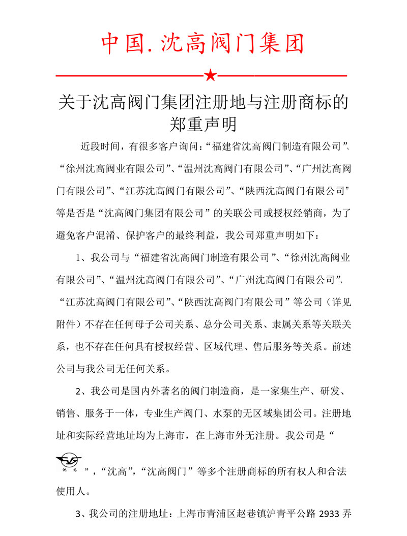 關(guān)于沈高閥門(mén)集團(tuán)注冊(cè)地與注冊(cè)商標(biāo)的鄭重聲明